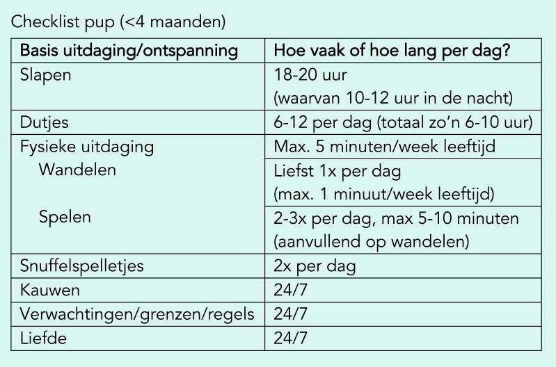 Voor pups geldt de regel van maximaal 5 minuten beweging per week leeftijd per dag. Dus een pup van 8 weken mag maximaal 8x5= 40 minuten bewegen per dag.